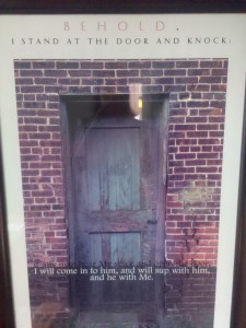 At first I keep walking down the hall and then I think, wait a sec, I think that really may be someone at the door.  Sure enough it’s a guy.  He’s pointing at our picture that sits on the table in the entryway that says, “I stand at the door and knock” and then he says through the glass – “See, I stand at the door and knock.”  I open the door and of course he’s asking for assistance and if we’re a church.  (I must say that I love our Winthrop Wesley sign and the symbol of the cross and flame that is now big on our wall outside, but no one ever stopped by and asked for assistance before we had that new sign.  I guess they didn’t think we were a church with the words “The Wesley Foundation” on the outside, probably thinking we were a bank or insurance company or philanthropy or something.)
